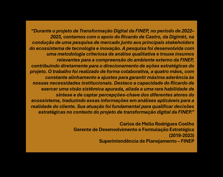 A DIGIMKT - Desenvolvimento Integrado de Gestão de Inovação - já conta com mais de 20 anos de trajetória sob a liderança de Ricardo de Castro - Executivo reconhecido por conectar soluções executivas com criatividade, inovação e alto impacto.